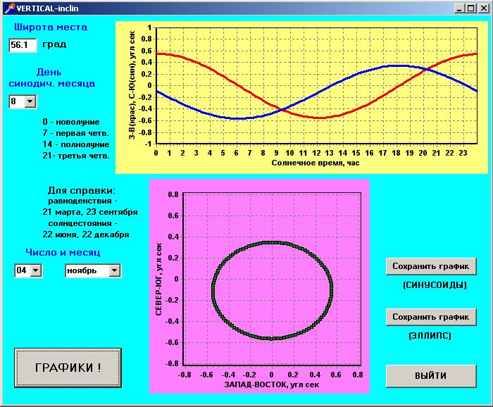 Программа VERTICAL-inclin рассчитывает и графически показывает суточные вращательные уклонения отвесных линий - эти уклонения, на наш взгляд, являются истинными генераторами приливных явлений в океанах. Программа показывает суточные хода "лунных" уклонений отвеса в проекциях на линии "север-юг" и "запад-восток", а также результирующую двумерную кривую уклонения отвеса в проекции на плоскость горизонта - в зависимости от широты места наблюдения, от дня в году и от текущей фазы Луны. Реальность этих уклонений отвеса подтверждена в экспериментальной работе "Прецизионные никлинометры..." - http://newfiz.narod.ru/inclin1.htm